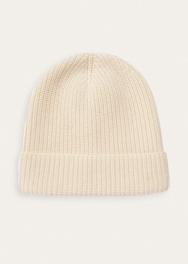 Шапка выполнена в молочном оттенке, который особенно эффектно выглядит в сочетании с классической симметричной вязкой.