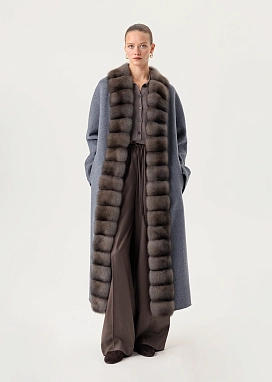 Удлиненное серое пальто с отделкой из меха соболя по борту