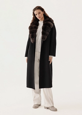 Эффектное пальто в классическом угольно-черном оттенке из итальянского кашемира с меховым воротником — обязательный предмет вашего базового гардероба.