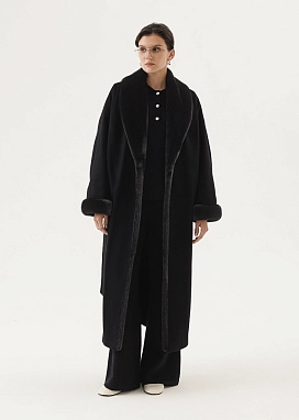 Пальто дополнено эффектными манжетами с отворотами из меха норки, невидимыми магнитными застежками, уютными боковыми карманами и широким кашемировым поясом.