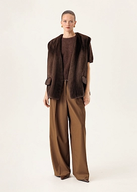 Укороченный жилет из меха норки длиной 70 см выполнен в двубортном стиле с V-образным вырезом. Прямой, слегка свободный крой делает образ лёгким и современным. Такая модель легко дополняет как повседневный, так и вечерний гардероб, и становится незаменимой вещью в зимнем гардеробе.