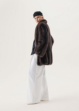 Классический силуэт короткой шубы из соболя с втачным рукавом и скрытыми прорезными карманами сочетает практичность с высокой эстетикой.